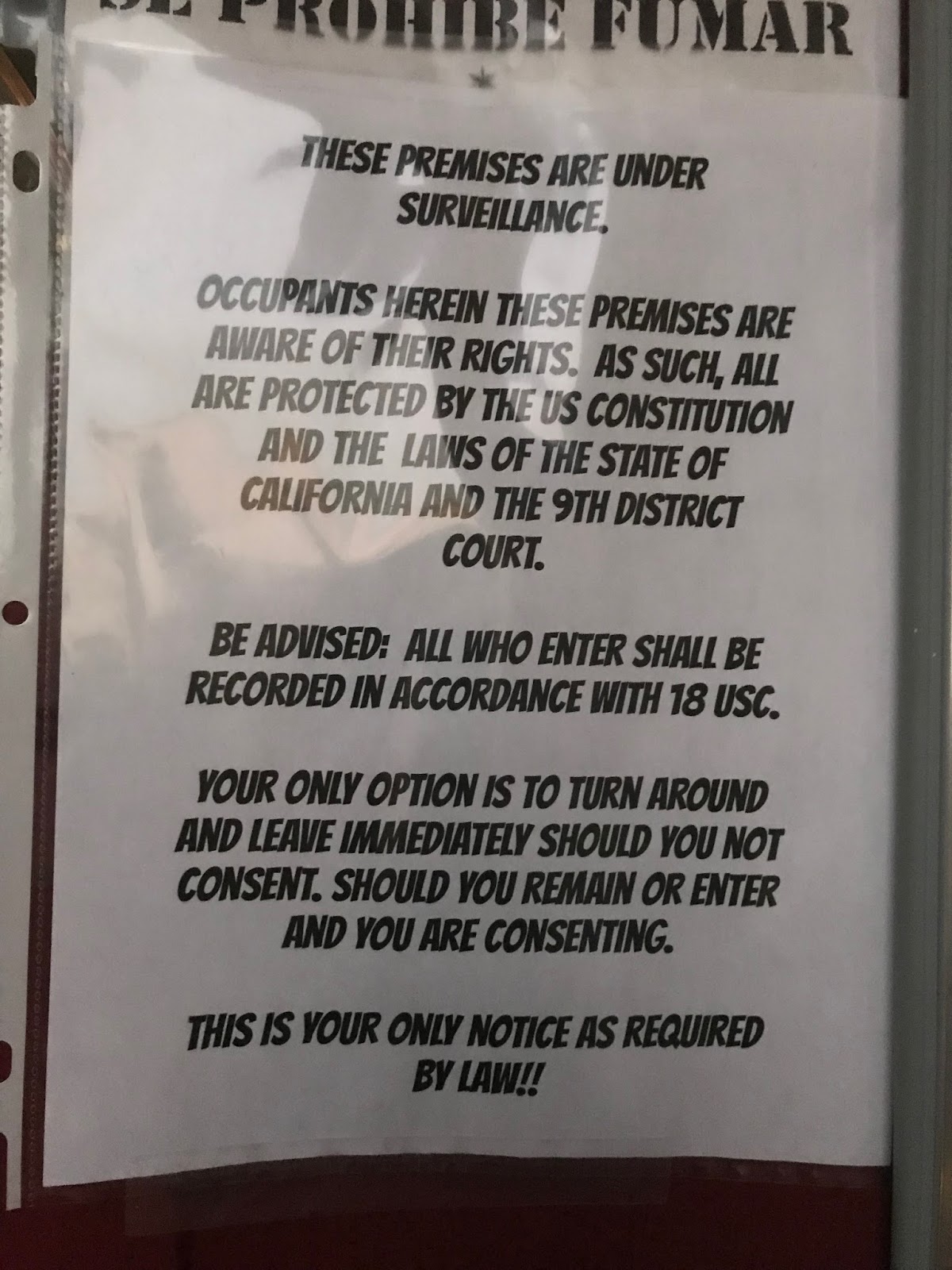 I luckily don't ever need to break the law to tell the truth. feel free to check out my beautiful door sign- feel free to squirm away. My local Law Enforcement and Community Neighborhood Watch Finds it amusing. What does this mean? I reserve the right to record and all who enter know it before they do. I choose to or NOT to as I see fit, within legal limitations. Property is under surveillance so I wouldn't try doing anything stupid.